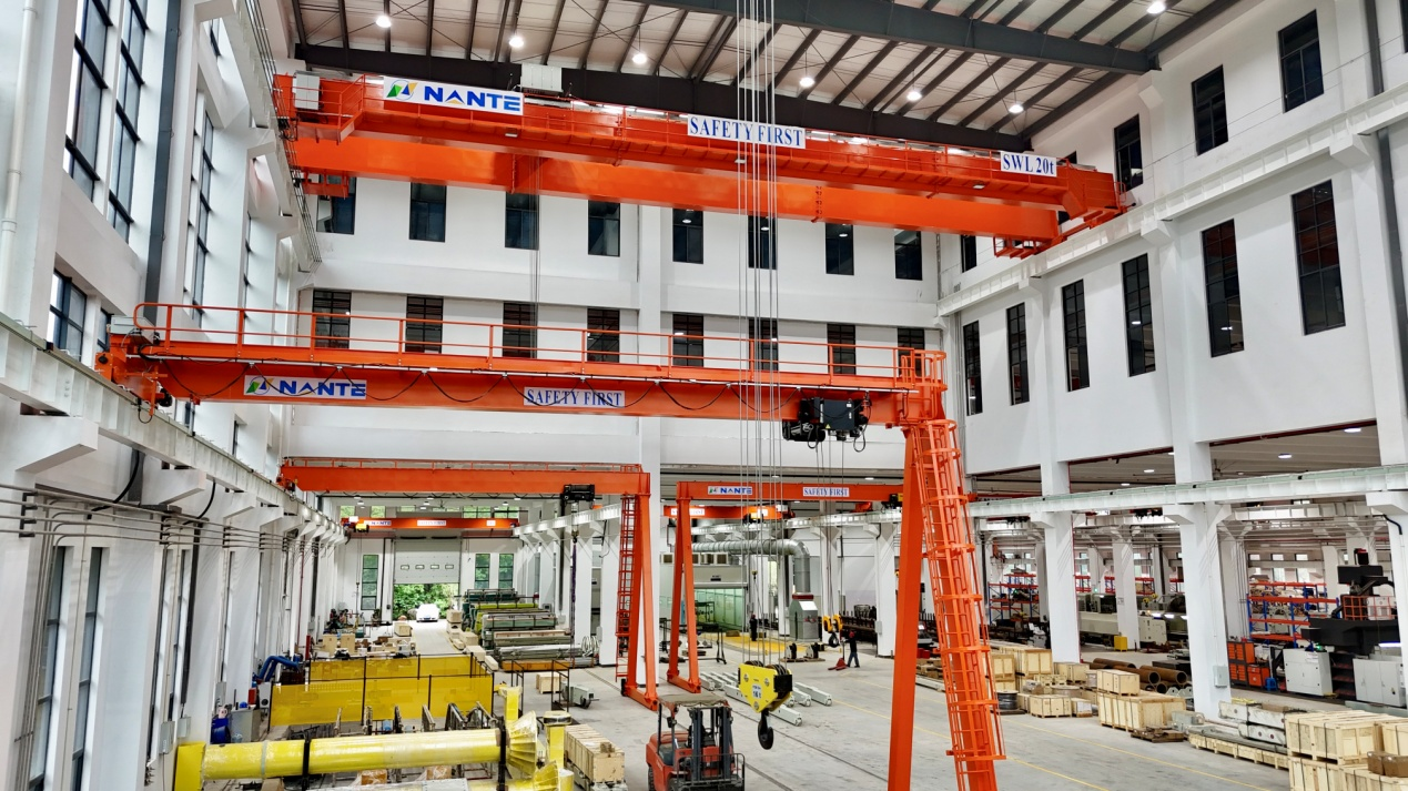 | Taller de montaje de grandes productos | Una luz de 30 metros y un espacio de elevación de 18 metros de altura equipado con dos grúas antibalanceo y tres grúas de semi-pór. Este espacio es compatible con el montaje y las pruebas de equipos a gran escala y grúas de alta resistencia. |